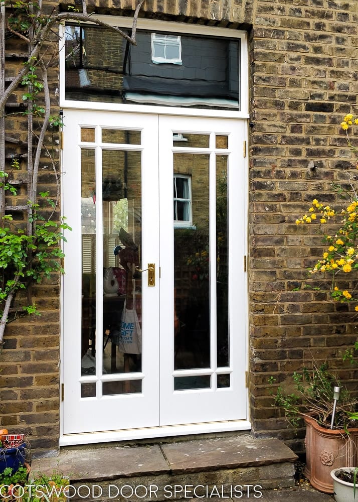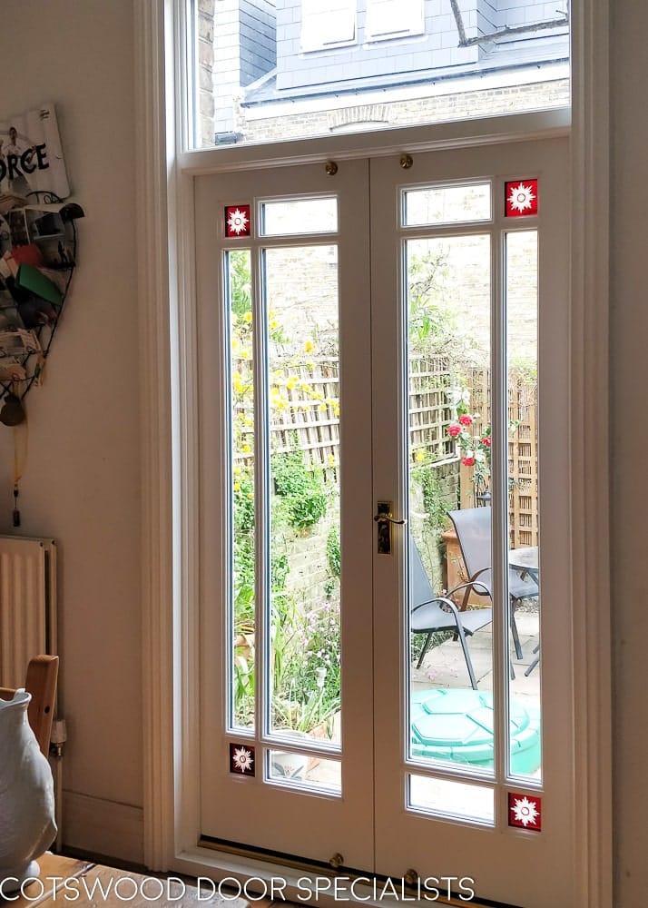 Fully glazed Victorian French doors set into original Victorian yellow stock brickwork. The full length glazing features slim vertical clear panes with a brilliant cut red glory star in each corner. Glory stars were a popular Victorian decorative glass feature, typically seen in cobalt blue or scarlet at the corners of sash windows or doors. Here, the decorative glass panels have been pressed as double-glazed units for optimum insulation, combining the artistry of traditional glass with ultra-modern glazing techniques.
